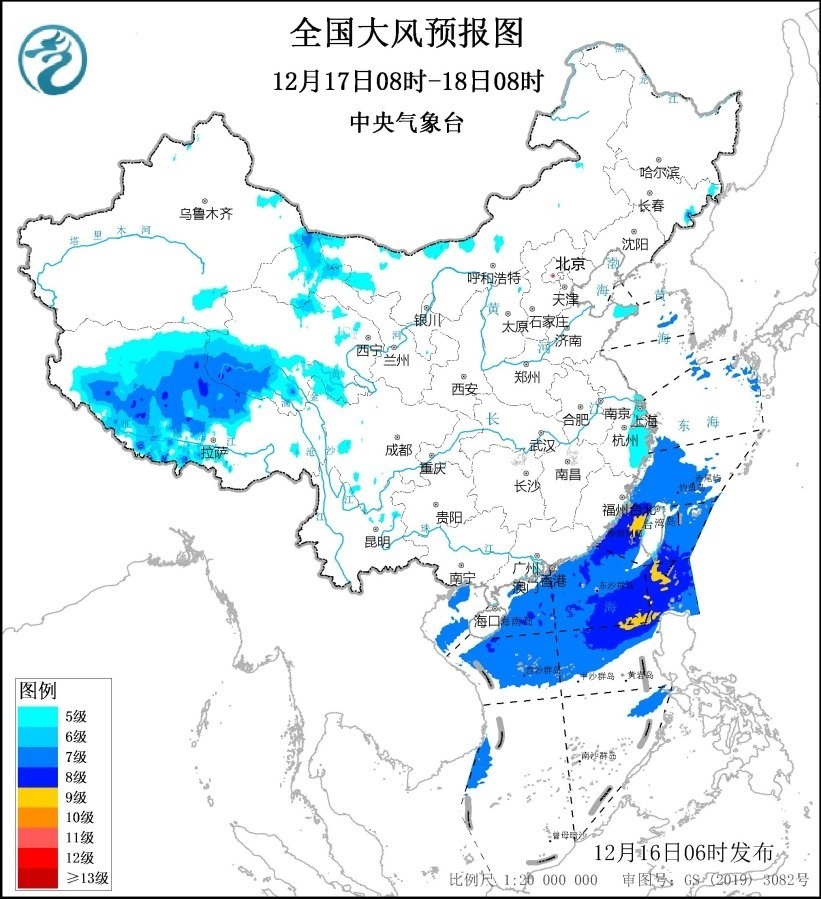 預(yù)計(jì),12月16日08時(shí)至17日08時(shí),內(nèi)蒙古中東部、西藏中西部、甘肅河西、河北北部、山東半島東部、江蘇南部、上海、浙江大部等地有5~6級(jí)、陣風(fēng)7~8級(jí)的大風(fēng),其中,西藏西北部的部分地區(qū)有7~8級(jí)、陣風(fēng)9~10級(jí)的大風(fēng);渤海、渤海海峽、黃海大部海域、東海大部海域、臺(tái)灣海峽、臺(tái)灣以東洋面、巴士海峽、南海北部和中部海域、北部灣將有7~8級(jí)、陣風(fēng)9~10級(jí)的大風(fēng),其中臺(tái)灣海峽、巴士海峽和南海東北部的部分海域風(fēng)力可達(dá)9級(jí)、陣風(fēng)10~11級(jí)。