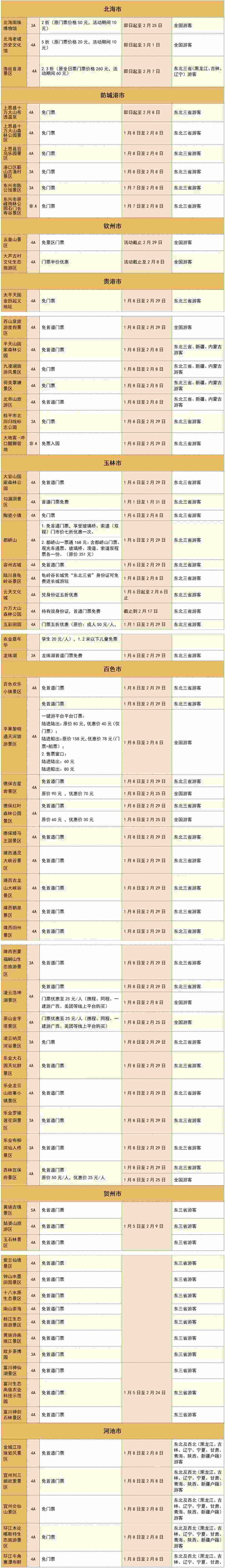 柳州程陽(yáng)八寨景區(qū)、桂林桂海晴嵐、百色靖西通靈大峽谷景區(qū)、百色樂(lè)業(yè)大石圍天坑群景區(qū)、賀州黃姚古鎮(zhèn)景區(qū)、河池羅城棉花天坑度假區(qū)、崇左德天跨國(guó)瀑布景區(qū)、崇左大新縣明仕景區(qū)、崇左左江花山巖畫(huà)景區(qū)等等,近兩百家廣西景區(qū)面向東北“老鐵”推出免門(mén)票或打折優(yōu)惠政策!此外,還有多家景區(qū)面向全國(guó)游客推出優(yōu)惠政策!