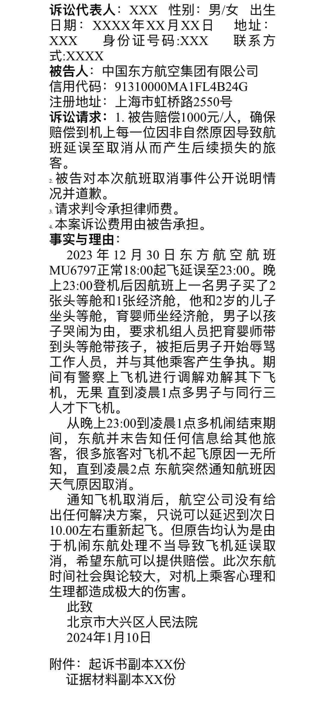 群內(nèi)發(fā)出的起訴書寫道:“從當(dāng)日23點(diǎn)到次日凌晨1點(diǎn)多機(jī)鬧結(jié)束期間,東航并未告知任何信息給其他旅客,很多旅客對(duì)飛機(jī)不起飛原因一無(wú)所知,直到凌晨2點(diǎn),東航突然通知航班因天氣原因取消。通知飛機(jī)取消后,航空公司沒(méi)有給出任何解決方案,只說(shuō)可以延遲到次日10點(diǎn)左右重新起飛。但原告均認(rèn)為是由于機(jī)鬧,東航處理不當(dāng),導(dǎo)致飛機(jī)延誤取消,希望東航可以提供賠償。此次東航事件社會(huì)輿論較大,對(duì)機(jī)上乘客心理和生理都造成極大的傷害?!睋?jù)悉,乘客們擬起訴至北京市大興區(qū)人民法院。