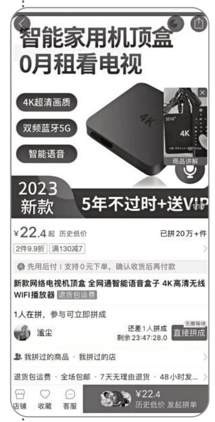 “0月租看電視”“這是一款可以讓你一輩子不用交有線電視費(fèi)的機(jī)頂盒”……在電商平臺(tái)上,一款網(wǎng)絡(luò)電視機(jī)頂盒各型號(hào)版本已售出超過20萬件,在同類商品中銷售量最高。記者購(gòu)買了一款售價(jià)47.88元的型號(hào),套裝內(nèi)包括機(jī)頂盒、配件以及永久會(huì)員。