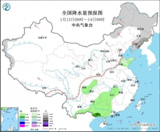 全國降水量預(yù)報圖(1月12日08時-13日08時)