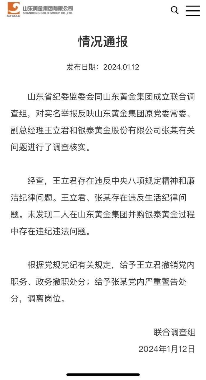 ·山東黃金集團通報男子舉報妻子出軌國企領(lǐng)導(dǎo):給予王立君撤銷黨內(nèi)職務(wù)、政務(wù)撤職處分。