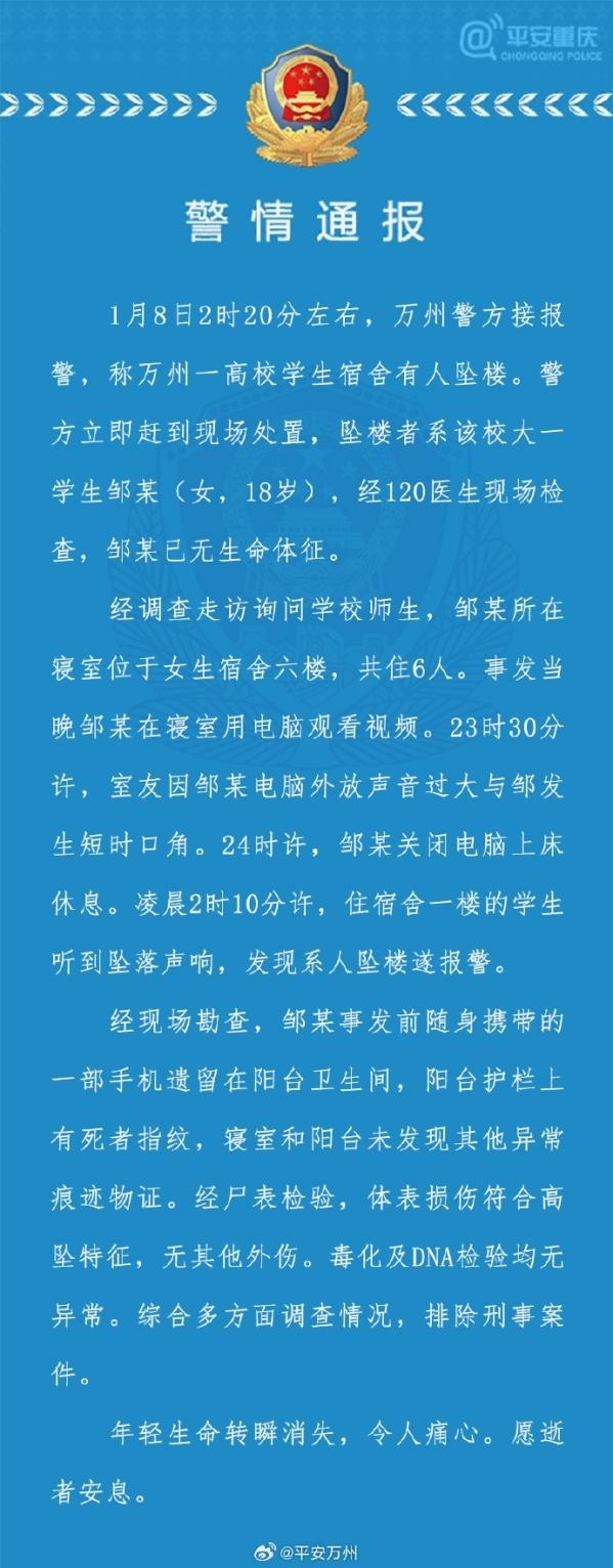 ·重慶警方通報大一女生校內(nèi)墜樓身亡:排除刑事案件,此前曾與室友發(fā)生口角。