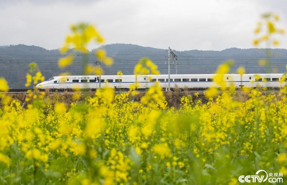 貴州黔東南,飛馳的高鐵行駛在鄉(xiāng)村田園間,與盛開的油菜花相映成景。