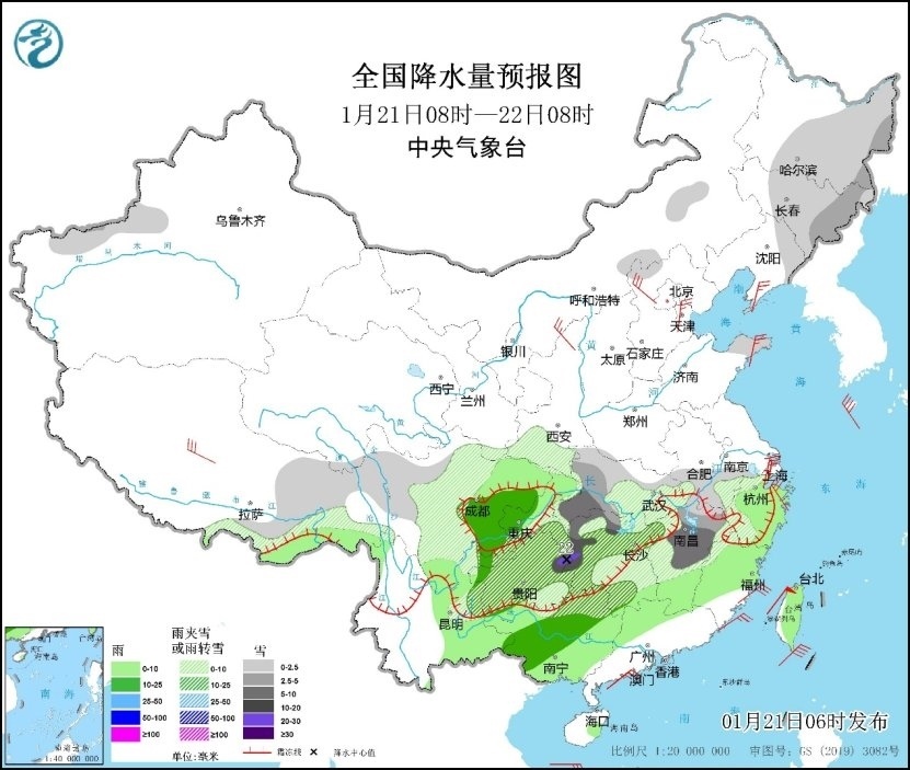 預(yù)計(jì)21日,湖北西南部、湖南中西部和北部、貴州中東部和西南部、重慶東部等地的部分地區(qū)有大到暴雪,其中,湖南西部、貴州東北部等地的部分地區(qū)有大暴雪(20~22毫米)。上述部分地區(qū)新增積雪深度3~8厘米,局地可達(dá)10厘米以上。此外,貴州、湖南西部和南部、廣西北部、廣東北部等地局地有凍雨。