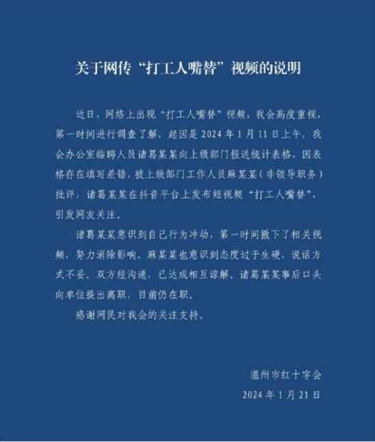 ·溫州市紅十字會回應網(wǎng)傳“打工人嘴替”視頻:表格填錯被批評引發(fā),雙方認識到自己不足已諒解。