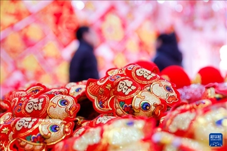 1月28日,市民在河南省焦作市武陟縣一處年貨市場選購新年飾品。