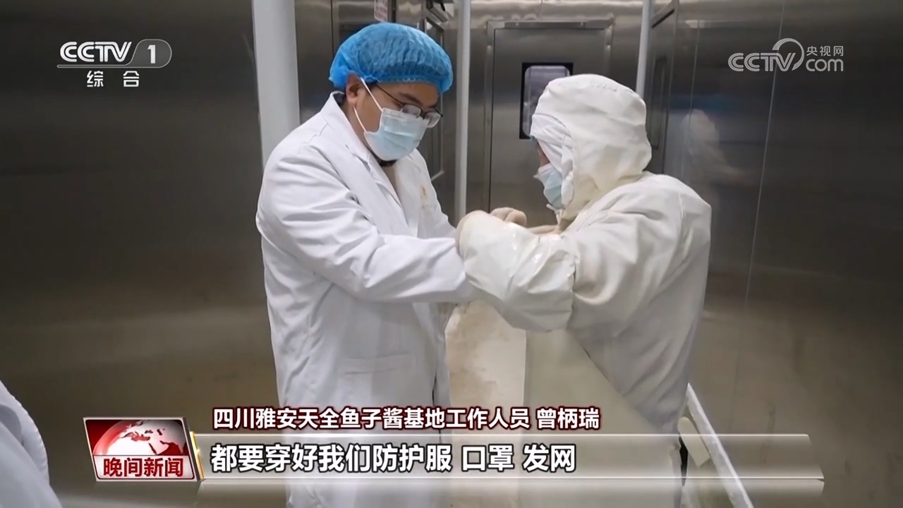 四川雅安天全魚(yú)子醬基地工作人員 曾柄瑞:每次進(jìn)加工車(chē)間都要穿好防護(hù)服、口罩、發(fā)網(wǎng),就像進(jìn)手術(shù)室一樣,經(jīng)過(guò)非常嚴(yán)格的消毒程序和控制,才能夠進(jìn)入加工車(chē)間。