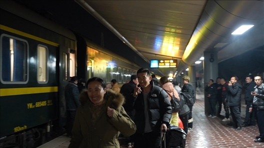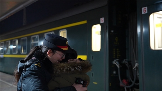 14號車廂內(nèi),來自黑龍江省齊齊哈爾市泰來縣的王興海和陳玉倩望著車窗外、站臺上的王靚怡,喜笑顏開??缭?700多公里、歷時52個小時,只為給女兒一個驚喜,陪她在崗過年。