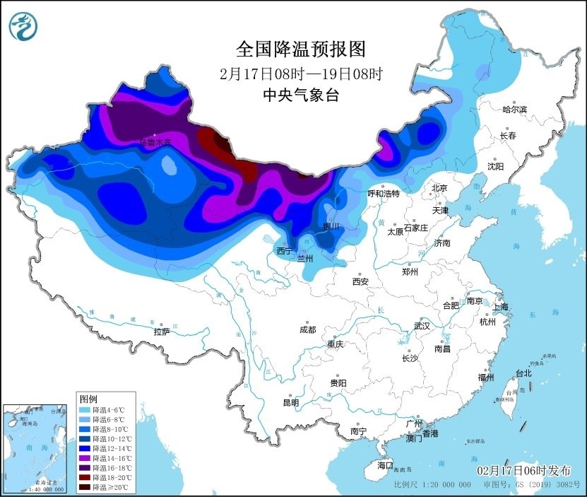 預(yù)計,2月17日08時至19日08時,新疆大部、內(nèi)蒙古中西部、甘肅大部、寧夏、青海北部等地將先后降溫6~12℃,其中,新疆北部、內(nèi)蒙古西部、甘肅河西等地部分地區(qū)降溫可達12~20℃,局地20℃以上。