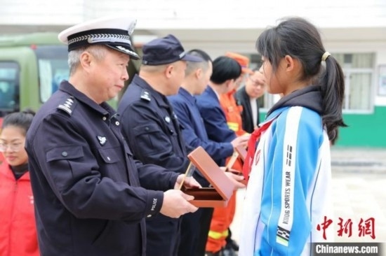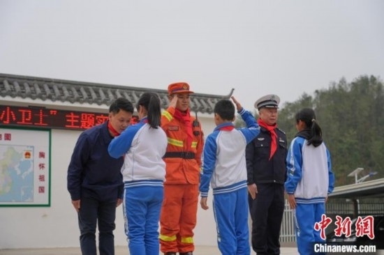 消防員、交警和電力工作人員聯(lián)合為學生代表頒發(fā)“安全小衛(wèi)士”證書,定期對學生傳授相關(guān)安全知識。李玲 攝