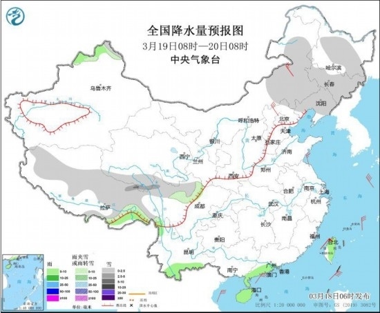 3月19日08時(shí)至20日08時(shí),內(nèi)蒙古東部、東北地區(qū)中南部、西藏北部和東部、青海南部、川西高原北部等地部分地區(qū)有小雪或雨夾雪,其中,西藏東北部等地部分地區(qū)有中到大雪。云南南部、廣東西南部、海南島、臺(tái)灣島大部等地部分地區(qū)有小雨。內(nèi)蒙古中部、河北北部等地部分地區(qū)有4~6級(jí)風(fēng)。
