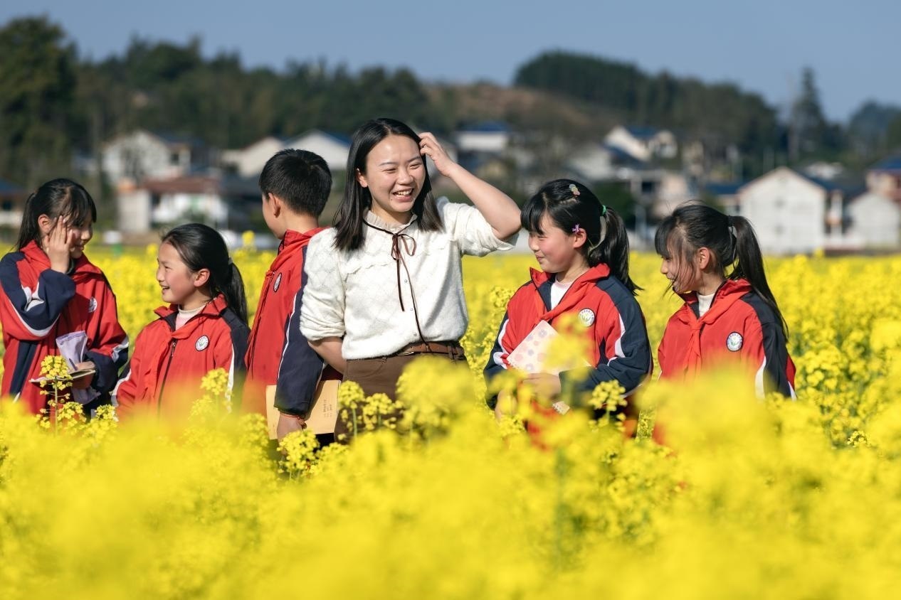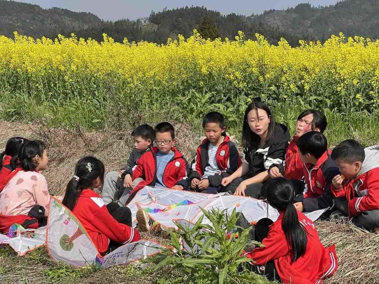 李柏霖不愿意讓孩子們覺得這樣的情緒是生活的全部。她把課堂搬到野外,在“搖搖花”開的時(shí)候帶孩子們?nèi)タ础皳u搖花”,油菜花開時(shí)去看油菜花?;ㄒ彩窃?,家鄉(xiāng)也是詩——若非如此,老師為什么走了又回呢?
