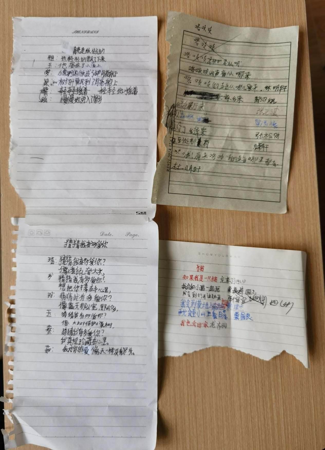 11歲的龍夢(mèng)瑤是詩班里高產(chǎn)的一個(gè)。她在本子上擠擠挨挨寫一團(tuán)字,一把撕下整頁,塞給李柏霖。這樣的紙片,李柏霖一天要收到幾十張。大大小小夾在書里,她晚上批改完,第二天再拿回學(xué)校,在課堂上分享。她估計(jì),孩子們寫的詩已經(jīng)超過2000首。