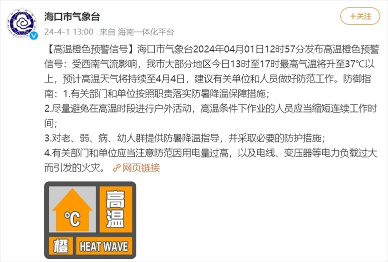 央視網(wǎng)消息:據(jù)@??谑袣庀笈_(tái) 微博消息,??谑袣庀笈_(tái)2024年04月01日12時(shí)57分發(fā)布高溫橙色預(yù)警信號(hào):受西南氣流影響,??谑写蟛糠值貐^(qū)今日13時(shí)至17時(shí)最高氣溫將升至37℃以上,預(yù)計(jì)高溫天氣將持續(xù)至4月4日,建議有關(guān)單位和人員做好防范工作。