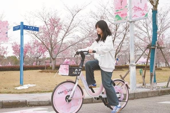 櫻花節(jié)期間,學(xué)校是禁止機(jī)動(dòng)車(chē)入校的。校園大,游人累了怎么辦?上經(jīng)貿(mào)大學(xué)生食堂門(mén)口便出現(xiàn)了一道亮麗的風(fēng)景線:那就是學(xué)校和“哈啰單車(chē)”聯(lián)名的粉色共享單車(chē)。50輛粉色的單車(chē)整齊排放在廣場(chǎng)上,車(chē)頭的粉色風(fēng)車(chē)迎風(fēng)轉(zhuǎn)動(dòng),櫻花節(jié)專(zhuān)屬I(mǎi)P“貿(mào)小櫻”人偶,揮舞著雙手邀請(qǐng)師生們前來(lái)騎行。聯(lián)名活動(dòng)設(shè)計(jì)了賞櫻打卡點(diǎn),游客可以騎著櫻花單車(chē)游覽校園,在3個(gè)最佳賞櫻點(diǎn)拍照打卡,體驗(yàn)各處櫻花的詩(shī)情畫(huà)意。
