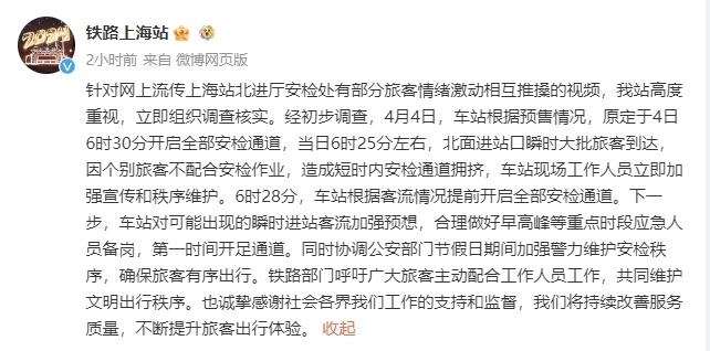 央視網(wǎng)消息:據(jù)@鐵路上海站 消息,針對網(wǎng)上流傳上海站北進(jìn)廳安檢處有部分旅客情緒激動相互推搡的視頻,車站高度重視,立即組織調(diào)查核實(shí)。經(jīng)初步調(diào)查,4月4日,車站根據(jù)預(yù)售情況,原定于4日6時(shí)30分開啟全部安檢通道,當(dāng)日6時(shí)25分左右,北面進(jìn)站口瞬時(shí)大批旅客到達(dá),因個(gè)別旅客不配合安檢作業(yè),造成短時(shí)內(nèi)安檢通道擁擠,車站現(xiàn)場工作人員立即加強(qiáng)宣傳和秩序維護(hù)。6時(shí)28分,車站根據(jù)客流情況提前開啟全部安檢通道。下一步,車站對可能出現(xiàn)的瞬時(shí)進(jìn)站客流加強(qiáng)預(yù)想,合理做好早高峰等重點(diǎn)時(shí)段應(yīng)急人員備崗,第一時(shí)間開足通道。同時(shí)協(xié)調(diào)公安部門節(jié)假日期間加強(qiáng)警力維護(hù)安檢秩序,確保旅客有序出行。鐵路部門呼吁廣大旅客主動配合工作人員工作,共同維護(hù)文明出行秩序,也誠摯感謝社會各界對其工作的支持和監(jiān)督,將持續(xù)改善服務(wù)質(zhì)量,不斷提升旅客出行體驗(yàn)。