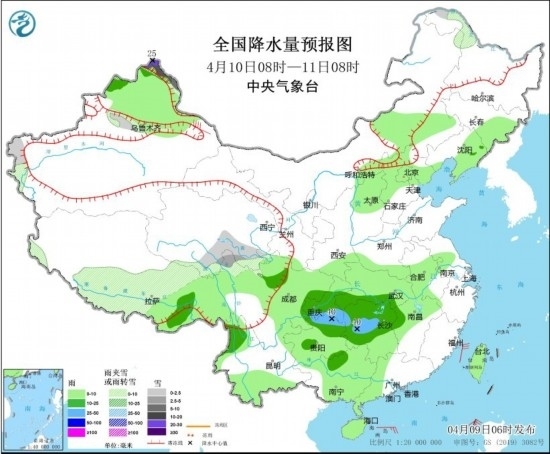 4月10日08時至11日08時,新疆北疆北部、黑龍江西北部、西藏中部和北部、青海東南部、川西高原北部等地部分地區(qū)有小到中雪或雨夾雪,其中,新疆北疆北部高海拔地區(qū)有大到暴雪,局地大暴雪(20~25毫米)。內(nèi)蒙古東部、華北北部、東北地區(qū)東部、新疆北部、西藏東部、四川盆地大部、重慶、江淮西部、江漢、江南北部和西部、貴州大部、廣西大部、云南西部和南部、海南島、臺灣島等地部分地區(qū)有小到中雨,其中,重慶東南部、貴州北部、湖南中西部等地部分地區(qū)有大雨(25~40毫米)。新疆東部部分地區(qū)有6~7級風。