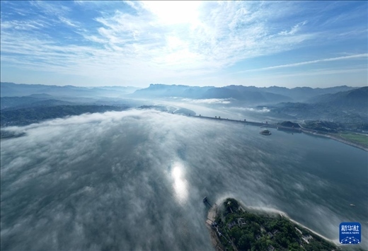 當(dāng)日,雨過天晴的三峽大壩及附近水域上空云霧繚繞,美景如畫。