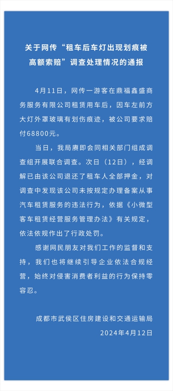 ·官方通報(bào)男子在成都遭遇“提燈驗(yàn)車”:已退還押金,涉事租車公司被行政處罰。