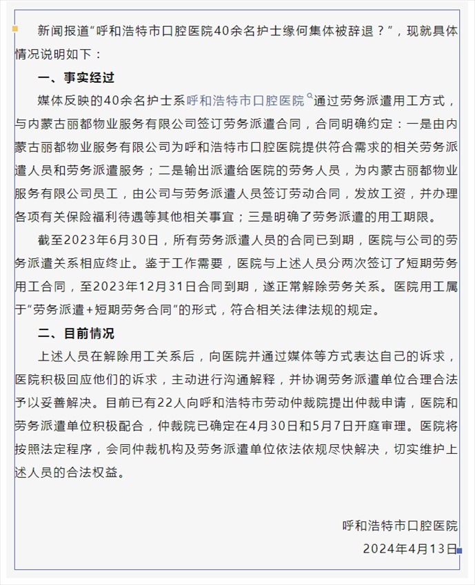 ·40余名護(hù)士無故被辭退?呼和浩特市口腔醫(yī)院發(fā)布情況說明。