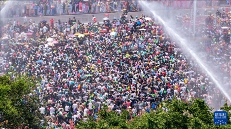 4月12日,云南省德宏傣族景頗族自治州2024年潑水狂歡節(jié)在芒市開幕,上萬名當(dāng)?shù)馗髯迦罕娕c遠(yuǎn)道而來的游客歡聚芒市廣場(chǎng),互相潑水祝福。