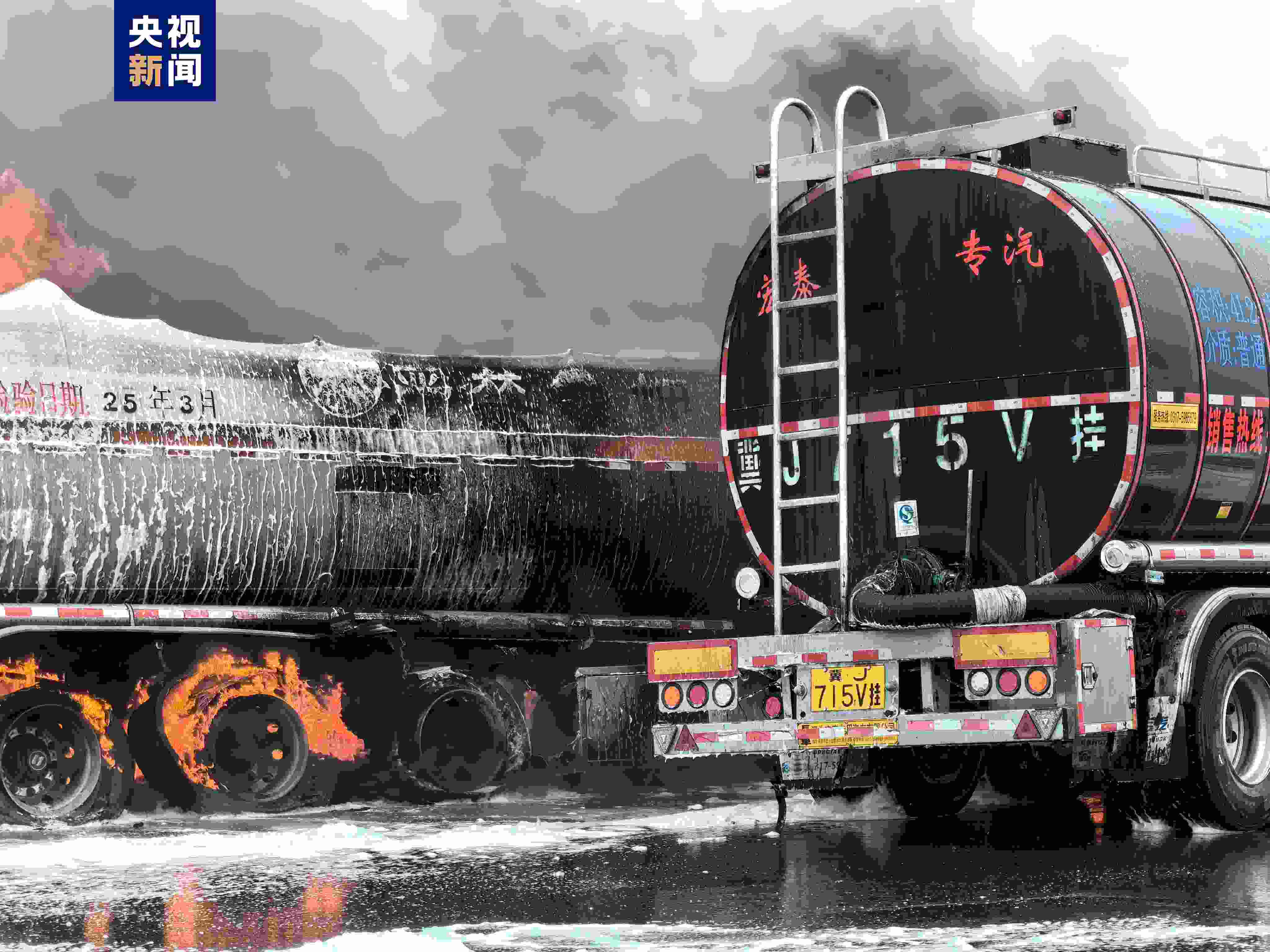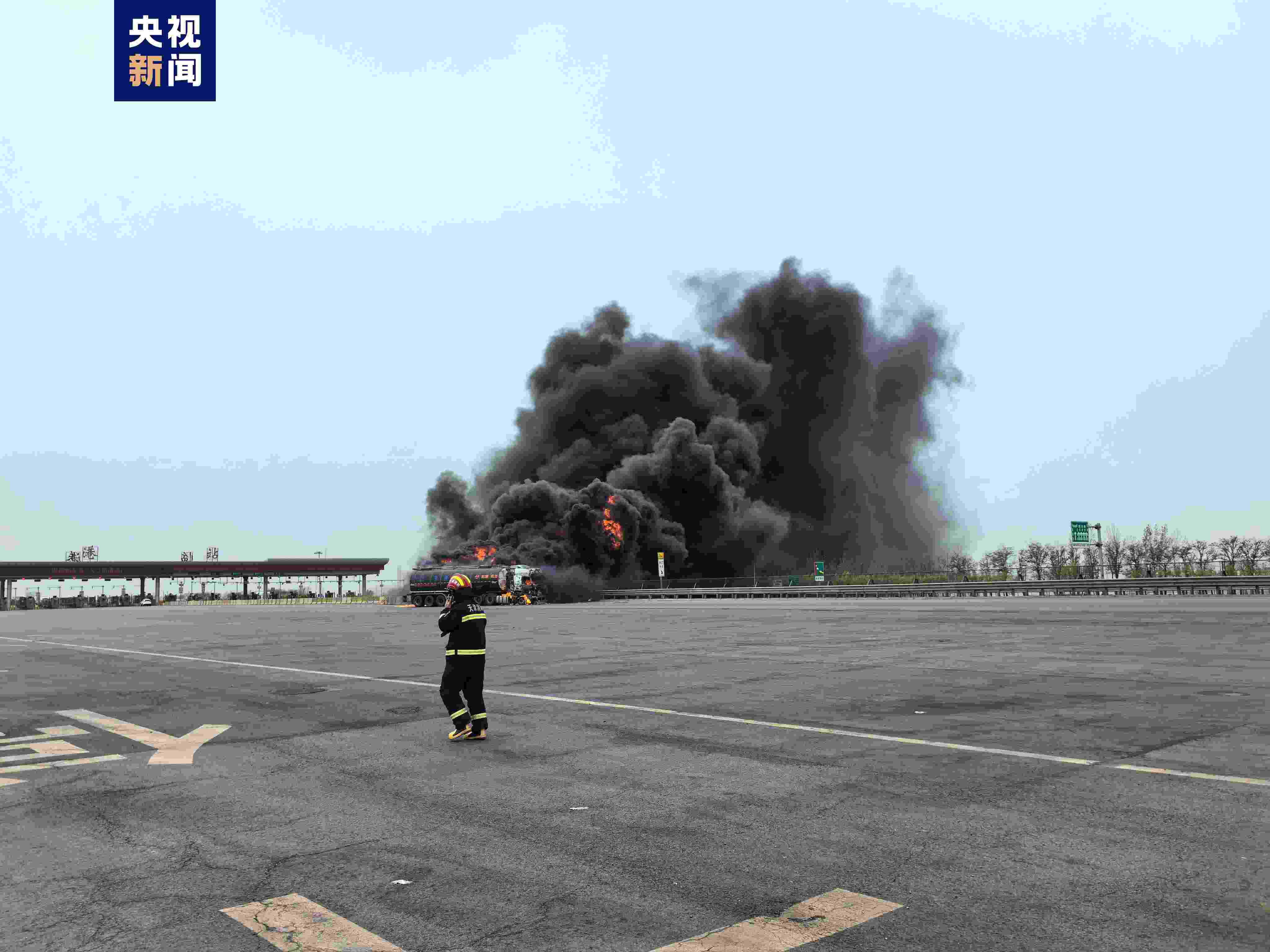天津?yàn)I海新區(qū)兩輛罐車發(fā)生交通事故后起火 1人受傷送醫(yī)