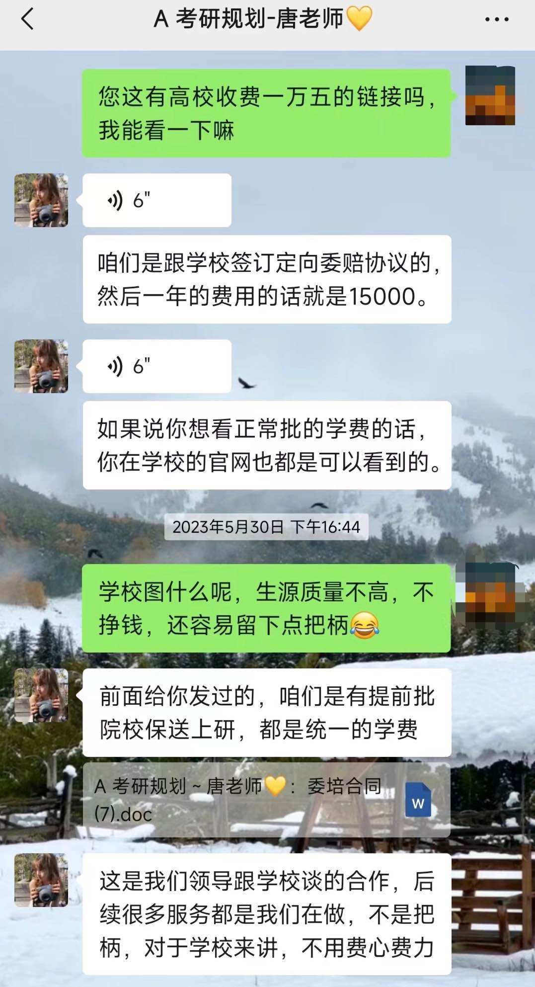 陳鑫說,對方得知他計劃報考中央財經(jīng)大學非全日制MBA后,還表示機構可以提供學費優(yōu)惠,一般MBA的學費大概是20萬左右,但該機構的招生老師說他們和中央財經(jīng)大學、對外經(jīng)貿(mào)大學、北京工商大學三所大學的非全日制工商管理專業(yè)都有渠道合作,不僅可以保證筆試、面試通過,還可以幫他走定向委培協(xié)議,這樣學費就只需要15000元一年。