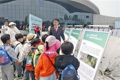 玉環(huán)法院綜合審判庭干警在漩門灣國家濕地公園,向小學(xué)生講解普法展板。