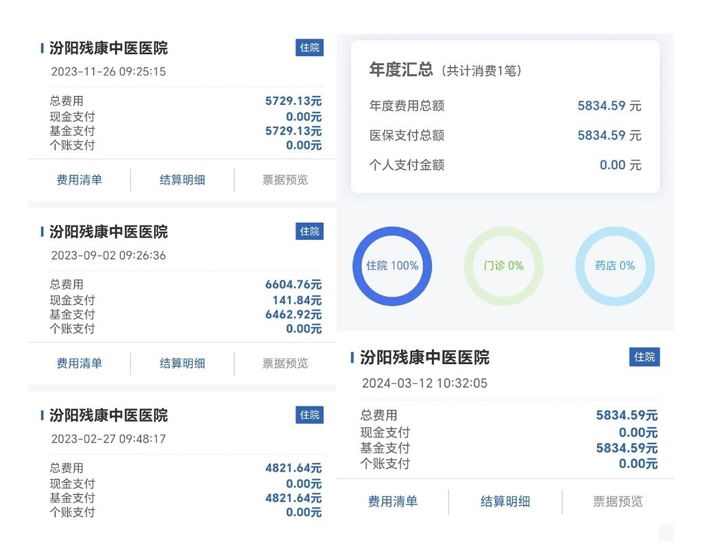 上圖是在國家醫(yī)保報銷平臺上查詢到的某位五保老人在殘康中醫(yī)醫(yī)院的醫(yī)保報銷記錄,2023年住院3次,2024年春季住院1次。(拼板照片)新華社發(fā)(楊哲攝)