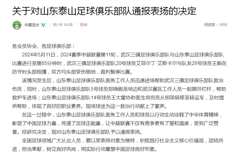 ·幫助救治武漢三鎮(zhèn)足球俱樂部隊傷員,中國足協(xié)通報表揚山東泰山俱樂部。