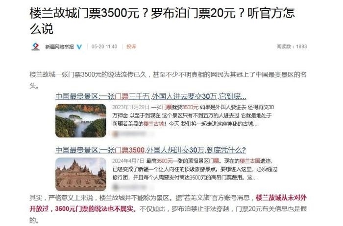 文章稱, ?樓蘭故城一張門票3500元的說(shuō)法流傳已久,甚至不少不明真相的網(wǎng)民為其冠上了中國(guó)最貴景區(qū)的名頭。其實(shí),嚴(yán)格意義上來(lái)說(shuō),樓蘭故城并不能稱為景區(qū)。據(jù)“若羌文旅”官方賬號(hào)消息,樓蘭故城從未對(duì)外開(kāi)放過(guò),3500元門票的說(shuō)法也不屬實(shí)。不僅如此,羅布泊禁止非法穿越,門票20元有關(guān)信息也是假的。