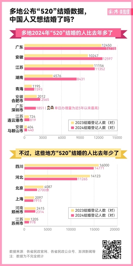 2023 年多地“520”領(lǐng)證人數(shù)下跌,引起熱議。2024 年的“520”剛剛過去,多地披露了當(dāng)日結(jié)婚登記數(shù)。廣東、安徽、江蘇等省當(dāng)日領(lǐng)證人數(shù)較去年有回升。澎湃新聞從深圳市民政局獲悉,截至 5 月 20 日 18 時(shí) 30 分,“520”全天共辦理結(jié)婚登記 1851 對(duì),單日辦理量為近 5 年以來最高。中國人又重燃對(duì)婚姻的渴望了嗎?