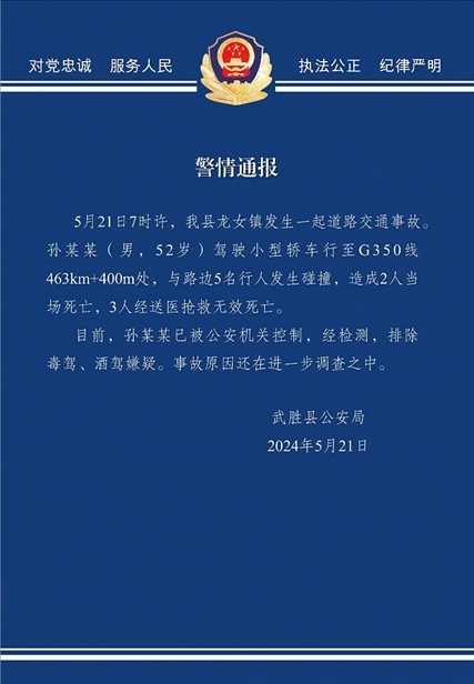 央視網(wǎng)消息:據(jù)平安武勝微信公眾號(hào)消息,5月21日7時(shí)許,武勝縣龍女鎮(zhèn)發(fā)生一起道路交通事故,孫某某(男,52歲)駕駛小型轎車行至G350線463km+400m處,與路邊5名行人發(fā)生碰撞,造成2人當(dāng)場死亡,3人經(jīng)送醫(yī)搶救無效死亡。目前,孫某某已被公安機(jī)關(guān)控制,經(jīng)檢測,排除毒駕、酒駕嫌疑。事故原因還在進(jìn)一步調(diào)查之中。