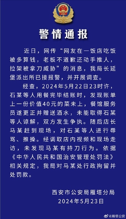 【8點見】在飯店吃飯被多算錢還遭威脅,西安雁塔警方通報