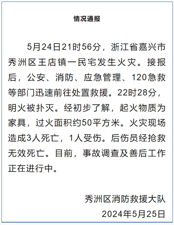 經(jīng)初步了解,起火物質(zhì)為家具,過火面積約50平方米。火災現(xiàn)場造成3人死亡,1人受傷,后傷員經(jīng)搶救無效死亡。目前,事故調(diào)查及善后工作正在進行中。