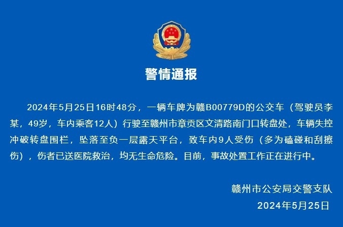央視網(wǎng)消息:據(jù)贛州公安微信公眾號(hào)消息,2024年5月25日16時(shí)48分,一輛車牌為贛B00779D的公交車(駕駛員李某,49歲,車內(nèi)乘客12人)行駛至贛州市章貢區(qū)文清路南門口轉(zhuǎn)盤處,車輛失控沖破轉(zhuǎn)盤圍欄,墜落至負(fù)一層露天平臺(tái),致車內(nèi)9人受傷(多為磕碰和刮擦傷),傷者已送醫(yī)院救治,均無(wú)生命危險(xiǎn)。目前,事故處置工作正在進(jìn)行中。