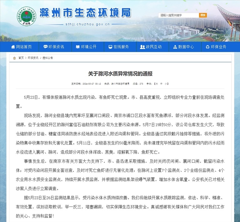 現(xiàn)場(chǎng)發(fā)現(xiàn),滁河全椒縣境內(nèi)荒草圩至襄河口閘段、南京市浦口區(qū)段水面有死魚(yú)漂浮,部分河段水體發(fā)黑。經(jīng)監(jiān)測(cè)溯源,位于全椒經(jīng)開(kāi)區(qū)的滁州富信石油助劑有限公司為主要污染來(lái)源。5月7日19時(shí)50分,該公司倉(cāng)庫(kù)發(fā)生火災(zāi),導(dǎo)致倉(cāng)儲(chǔ)的部分甘油、糖蜜連同消防廢水經(jīng)地表徑流進(jìn)入附近溝渠和管網(wǎng)。全椒縣通過(guò)筑壩截污抽排等措施,將外泄的污染物集中收集存放和無(wú)害化處置。5月11日,全椒縣發(fā)生約50毫米降雨,尚未清理完畢殘留在溝渠和管網(wǎng)內(nèi)的污水經(jīng)雨水徑流進(jìn)入襄河、滁河,造成部分河段水體渾濁、黑臭,溶解氧下降,魚(yú)蝦死亡。公安機(jī)關(guān)已對(duì)相關(guān)涉案人員進(jìn)行立案調(diào)查。