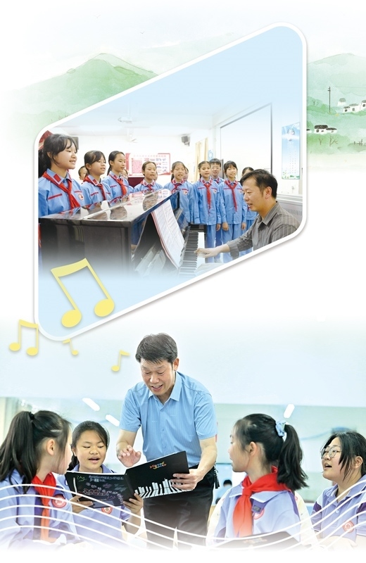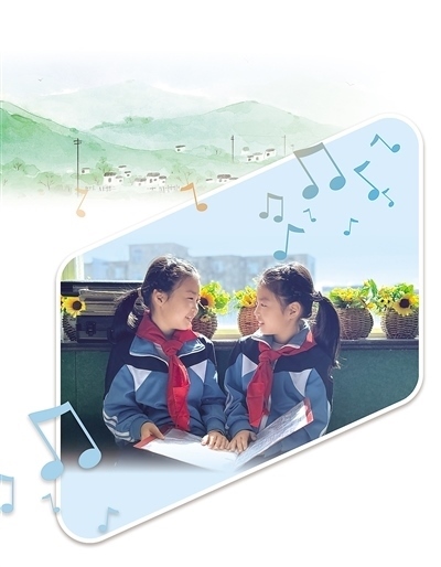 講臺上,隨著廖光新的雙手向前一打開,學(xué)生們齊刷刷地唱了起來?!敖裉焯鞖夂茫フ腋赂拢ㄍ馄牛﹪D……”稚嫩而清脆的聲音瞬間充滿整個教室,透過窗戶傳向遠處的大山。