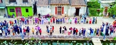 在青田,藝術(shù)讓這個(gè)村落慢慢蘇醒,也讓青田人對家鄉(xiāng)充滿驕傲與自豪。除了青田水鄉(xiāng)藝術(shù)季、“上善若水——藝術(shù)龍舟行動(dòng)”等活動(dòng),一場“走田”主題時(shí)裝秀,更是點(diǎn)燃了村民的熱情。穿著設(shè)計(jì)師以鄉(xiāng)村生產(chǎn)生活為靈感設(shè)計(jì)的服裝,佩戴著自己親手制作的香云紗配飾,道具是平日田間勞作的老物什,村民“模特”們雖面露羞澀,但走在自己最熟悉的鄉(xiāng)野,走出的是自信、堅(jiān)定的步伐,仿佛在告訴每一個(gè)人,這就是我們的生活,我們的時(shí)尚。