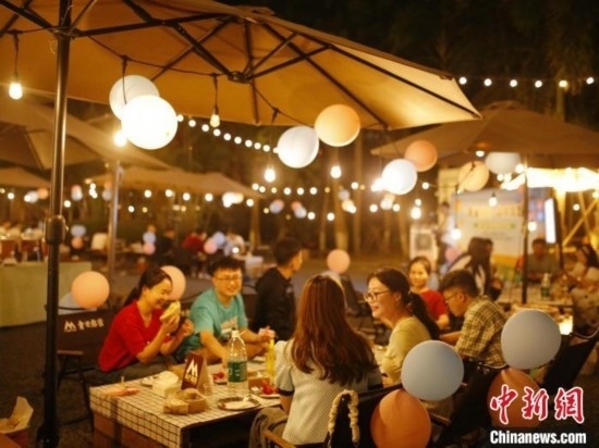 活動現(xiàn)場,搭建了露營帳篷、休閑桌椅一字排開,布置了彩色氣球,提供甜品、水果、飲料等,燈光閃爍、晚風(fēng)習(xí)習(xí),氛圍甜蜜而浪漫。