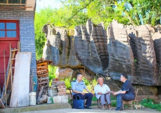 圖②:干警與村干部親切交談,交流“楓橋經驗”工作。