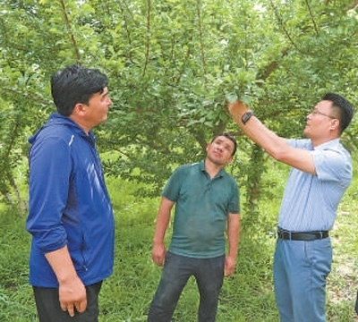 走進(jìn)居民玉素普艾力·達(dá)吾提的果園,徐學(xué)彬正與果農(nóng)交流農(nóng)業(yè)知識:“今年人工授粉,掛果挺好,但還要把防蟲、疏果、施肥放在心上,這才能保證果實(shí)的品質(zhì)?!庇袼仄瞻Αみ_(dá)吾提連連點(diǎn)頭,說:“你放心,我記著!”