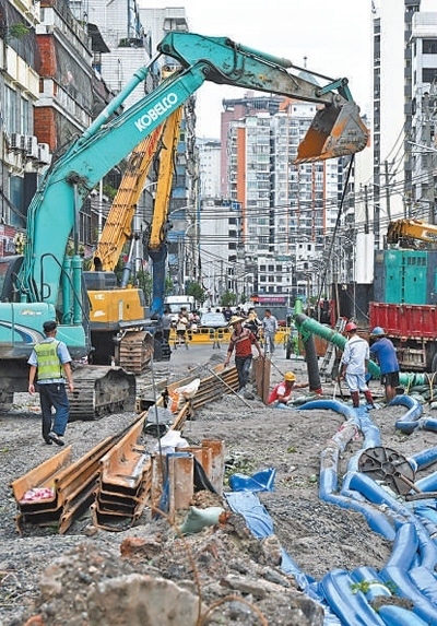 9月7日,海南省??谑泄ぷ魅藛T在加緊抽排城市雨水。新華社記者 郭 程攝