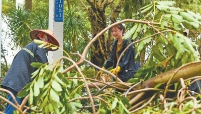 9月7日,海南省??谑泄ぷ魅藛T在??谑袨I海大道上清理被風(fēng)吹倒的樹木。新華社記者 楊冠宇攝