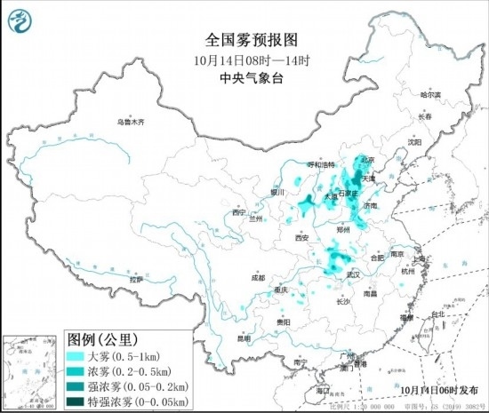 全國(guó)霧預(yù)報(bào)圖(10月14日8時(shí)-14時(shí)) 圖片來(lái)源:中央氣象臺(tái)網(wǎng)站