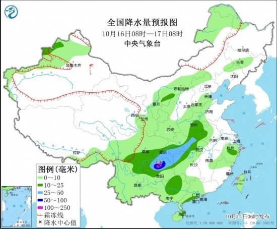 10月16日8時(shí)至17日8時(shí),四川東南部、重慶中南部、貴州中北部、湖南西北部、湖北西南部和中部等地部分地區(qū)有中到大雨,其中,四川東南部、貴州北部等地局部地區(qū)有暴雨或大暴雨(100~110毫米)。內(nèi)蒙古東北部、黑龍江西北部、新疆西部、青海南部、西藏東部、四川西部等地有小到中雪,局地大雪或暴雪。