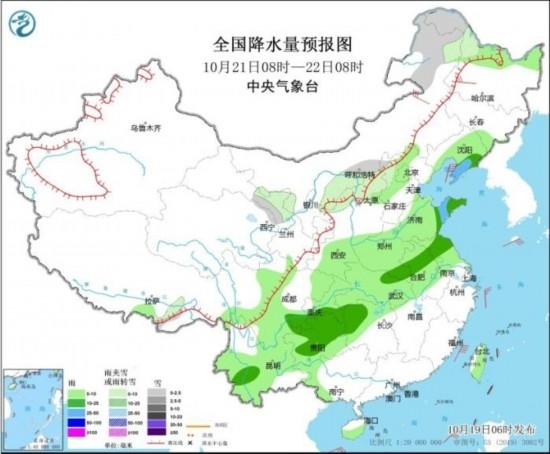 全國降水量預(yù)報(bào)圖(10月20日08時-21日08時)。圖片來源:中央氣象臺網(wǎng)站