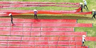 3月26日,廣東省佛山市順德區(qū)一香云紗產(chǎn)研文化基地的工人,利用晴好天氣抓緊時間曬香云紗。王國榮攝(人民圖片)