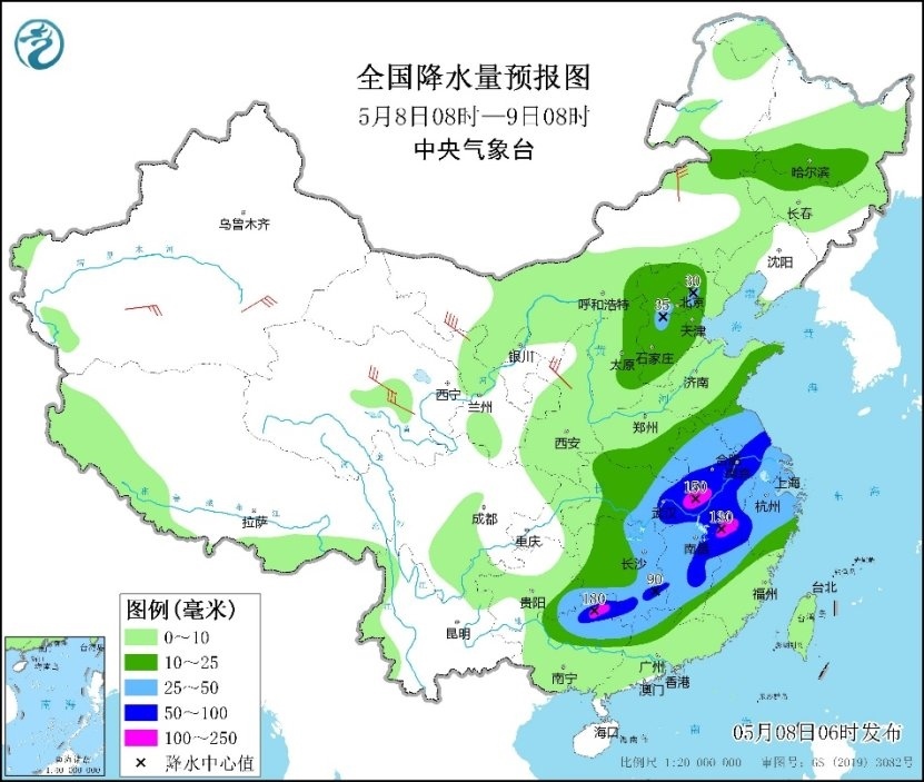 預(yù)計(jì)今天白天至夜間,江淮大部、江漢東部、江南西南部和中東部、華南北部以及華北東北部等地部分地區(qū)有大到暴雨,其中,安徽西南部、湖北東部、江西東北部、浙江西部、廣西北部等局地有大暴雨;上述部分地區(qū)伴有短時(shí)強(qiáng)降水、8級(jí)以上雷暴大風(fēng)或冰雹天氣等強(qiáng)對(duì)流天氣,其中,安徽西南部、湖北東部、湖南東部、江西中北部、廣西東北部等局地將有10級(jí)以上雷暴大風(fēng),最大風(fēng)力可達(dá)11級(jí)以上,江西北部等地局地不排除出現(xiàn)龍卷的可能性。